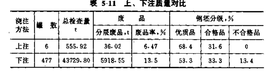浇注沸腾钢通常采用上小下大直通型 钢锭模 ,一般各厂都按照各自轧机的能力、产品大纲(用户的需求)、浇注的钢种来选择钢锭模尺寸及工艺参数。外洋沸腾钢多采用较大吨位锭型(如 15 一 25t 。我国目前使用的锭型有 19.6t,14.2t,11.2t,8.2t  , 7.1t,5.6t,2.1t, 及 8 英寸( in )、 6 英寸( in )钢锭。大钢锭有方锭和扁锭,含碳较高的沸腾钢一般不采用很小断面的锭模浇注,小的沸腾钢断面应不小于 150x 150rnm 。沸腾钢的浇注方法分为上注法和下注法.外洋采用上注法较多。上注通常是单个锭或双锭(用双塞棒或双滑动水口浇注),注速较快( 0 . 5 一 2 .0m  / min ) ,因此钢锭模内沸腾较差,钢锭的坚壳带较薄,易上涨,易飞溅引起结疤。但上注工艺简单、成本较低、消耗耐火材料少,因此钢中夹杂和分层缺陷.较少。见表 5 一 11 .